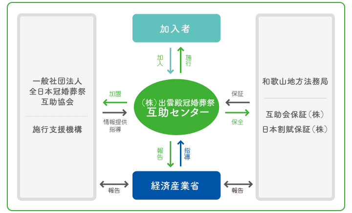 出雲殿冠婚葬祭互助センターは、全日本冠婚葬祭互助協会に加盟し、安心できるサービスの提供と高い質を守る指導をクリアしています。また、互助会加入者支援機構へも加盟し、会員様が結婚式やお葬式の施行サービスを受ける利用権も守られています。